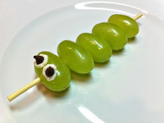 PREPARACIÓN: Introduce las uvas en la brocheta y para terminar haz los ojos del gusano con unas gotitas de chocolate.
